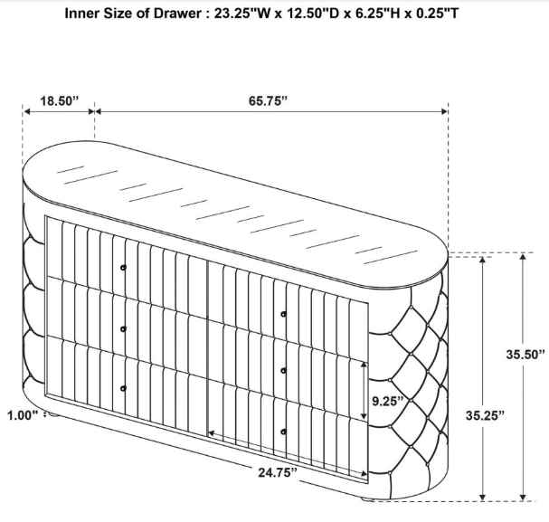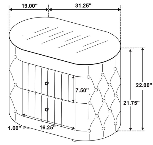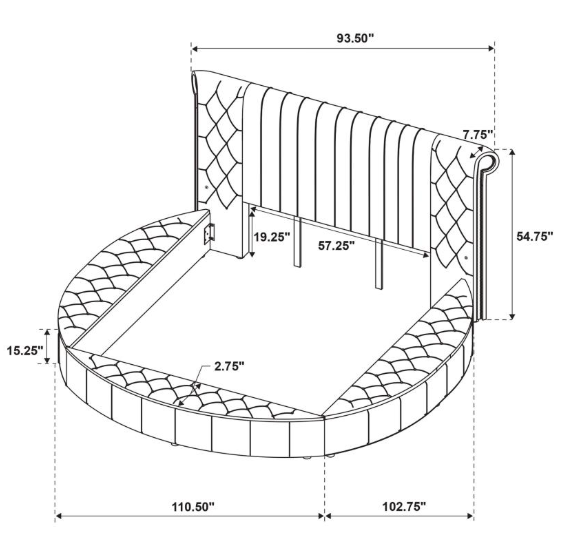 | • Round bed features a fully upholstered frame with hidden storage beneath lift-up panels • Scroll-back headboard includes vertical channeling and deep tufting in soft velvet fabric • Dual USB charging ports with USB-A and USB-C access are built into both sides of the bed • Coordinating case pieces feature velvet upholstery with vertical stitching and crystal accents • Glass-topped surfaces offer durability while enhancing the visual elegance of each piece • Constructed from solid rubberwood, engineered wood, velvet, foam, and mirrored materials |